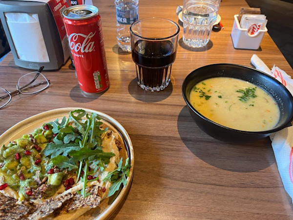 I actually wasn’t that hungry so I got the homemade chicken soup (6.99 BGN) and the corsica salad (10.99 BGN), which had hummus, avocado, onions, and other tasty veggies. I thought they were both pretty good, especially the chicken soup.